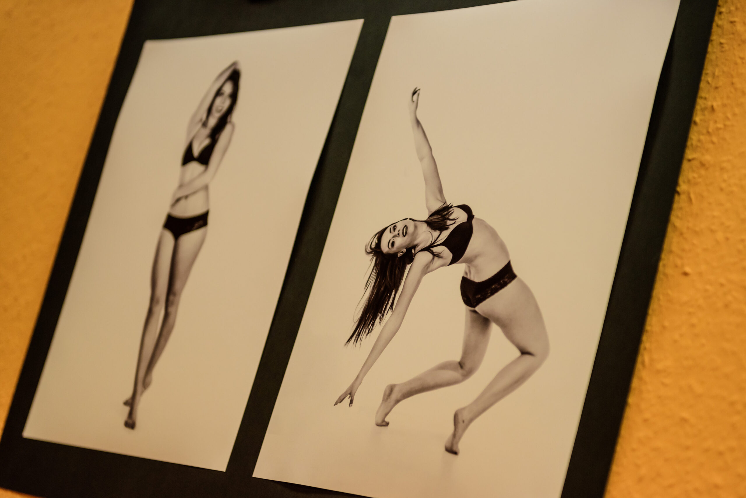 Zwei Fotos einer Frau in schwarzer Unterwäsche. Einmal stehend, einmal im Sprung zu einem Rad.