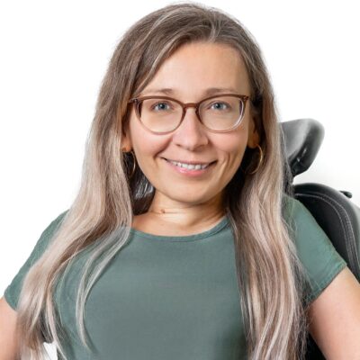 Lächelnde Frau mit braunem Haar bis zu den Ohren. Kopfstütze im Hintergrund.